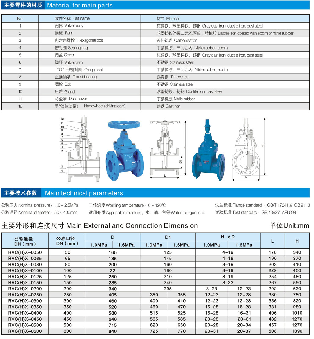 RVCX buried resilient seated gate valve consists of valve body, bonnet, stem, stem nut, gate and other parts. The valve using elastic disc produce elastic deformation compensation effect to achieve good sealing effect, this valve has the switch light, reliable sealing, good elastic memory and long service life and other significant advantages, USES the full size, non-rising stem operation, flange bolt connection, flat type seat, without sundry precipitation. It is widely used in running water, sewage, building and stone.Oil, chemical, food, medicine, light textile, power, ship, metallurgy, energy system and other fluid pipelines as the adjustment and closure device used.